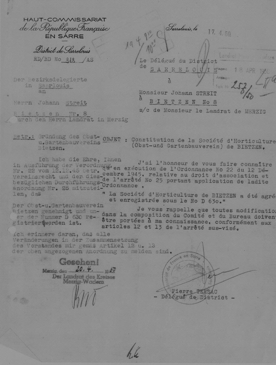 Liebhaber für Obst- und Gartenbau schlossen sich in einzelnen Gemeinden zusammen und gründeten Vereine. Auch in den Bietzerberggemeinden Bietzen, Harlingen und Menningen wurde im Jahre 1923 der Entschluss gefasst den "Obst- und Gartenbauverein Bietzerberg" zu gründen.